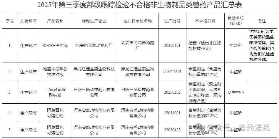 2025年第三季度省级监督抽检不合格非生物制品类兽药产品汇总表