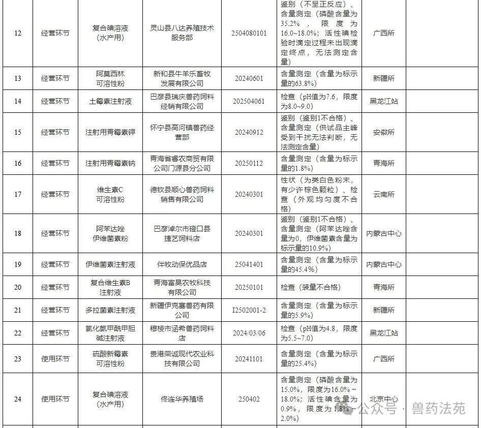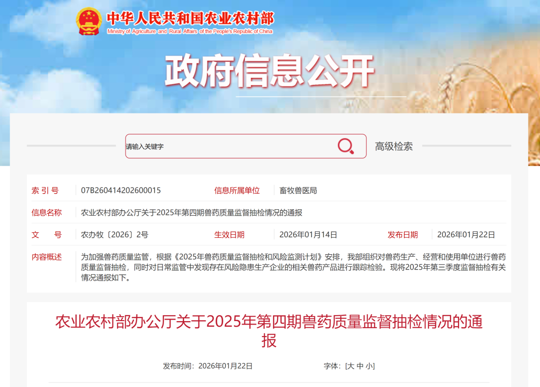农业农村部办公厅关于2025年第四期兽药质量监督抽检情况的通报