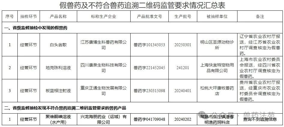省级监督抽检中发现假兽药3批,不符合兽药追溯二维码监管要求的产品1批。