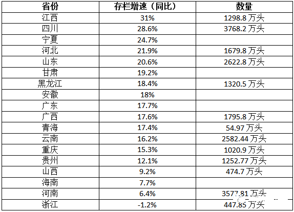 从已公布省份前三季度生猪存栏数据来看,除了浙江小幅减少(-1.2%)之外,其余所有省份都实现了正增长,其中江西增长最快,达到31%,大多数省区市基本提前完成了年度生猪生产任务。