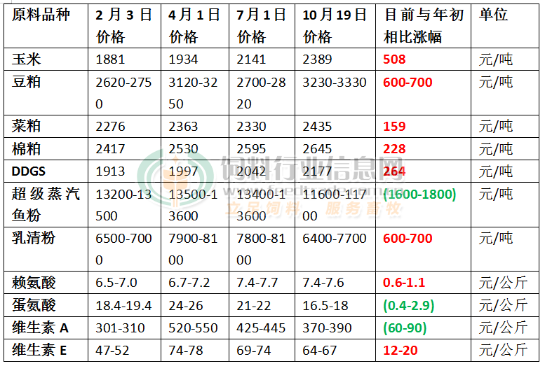 据中国饲料行业信息网统计,今年以来到10月19日,玉米价格上涨500元/吨,豆粕价格上涨600-700元/吨。